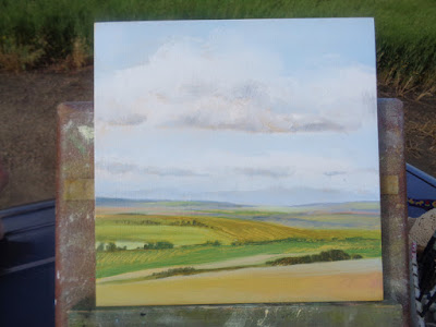 My husband has taken his work holidays, during which time we take a few local road trips. Of course we bring our painting kits with us! Here's one I did on the hills above Drumheller a couple of weeks ago.